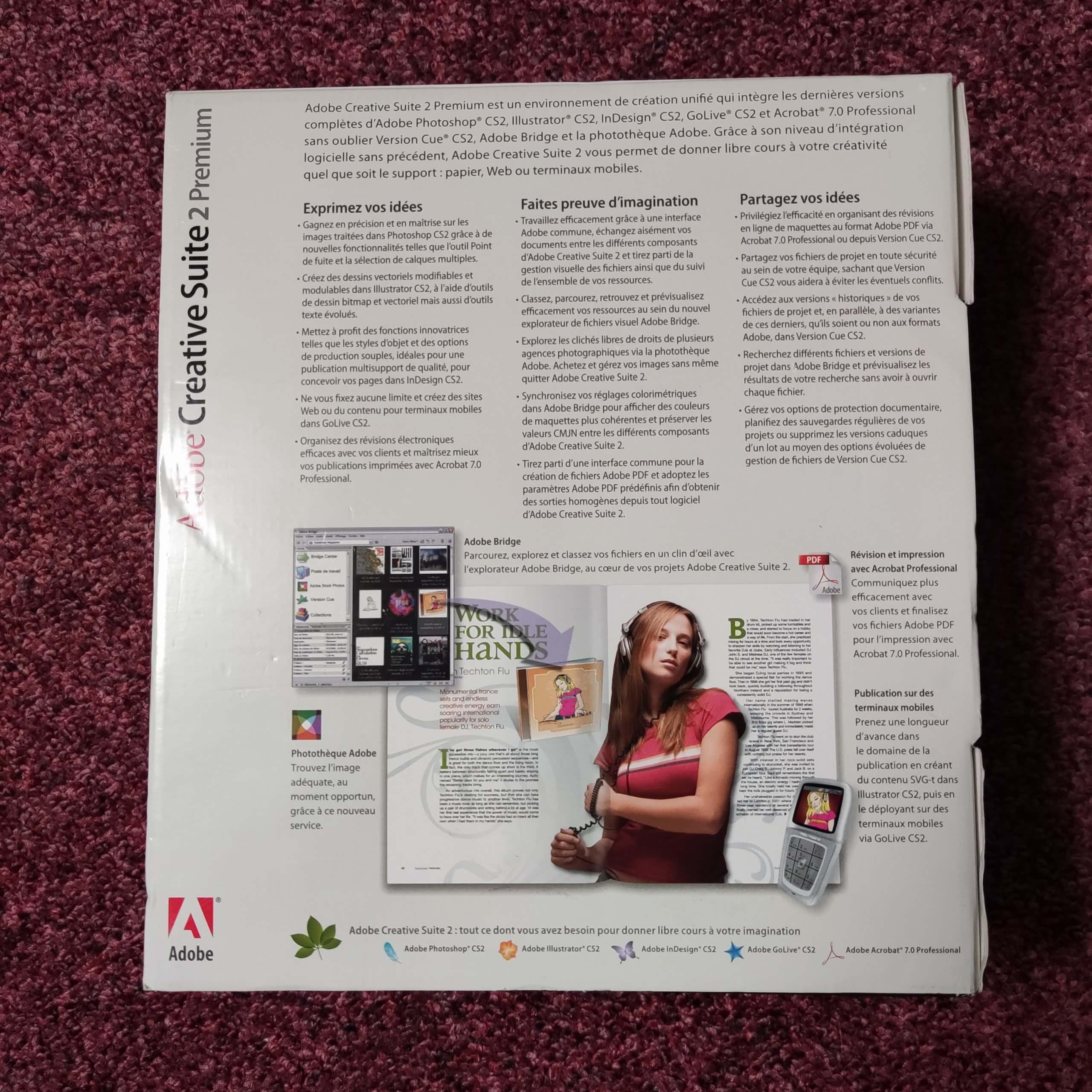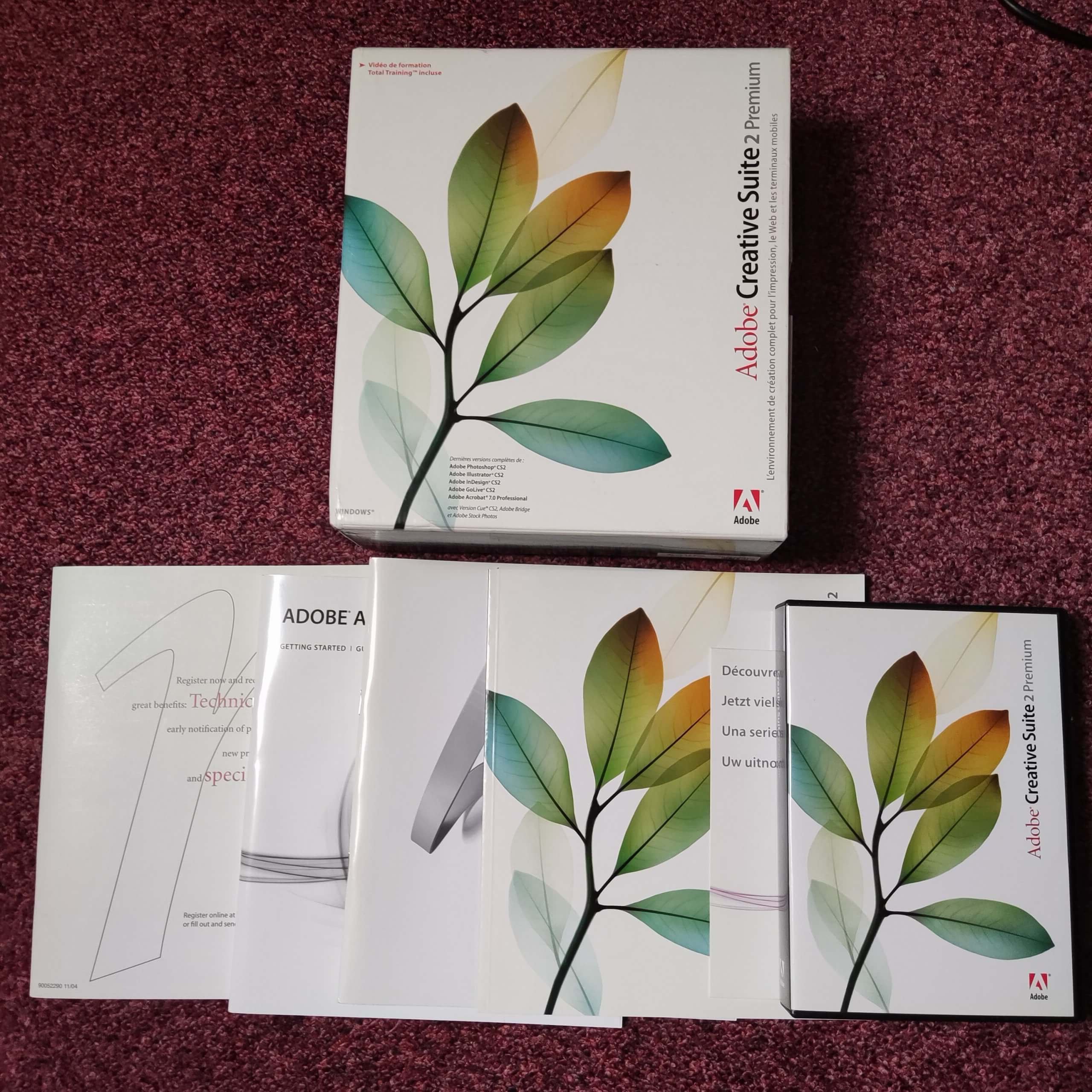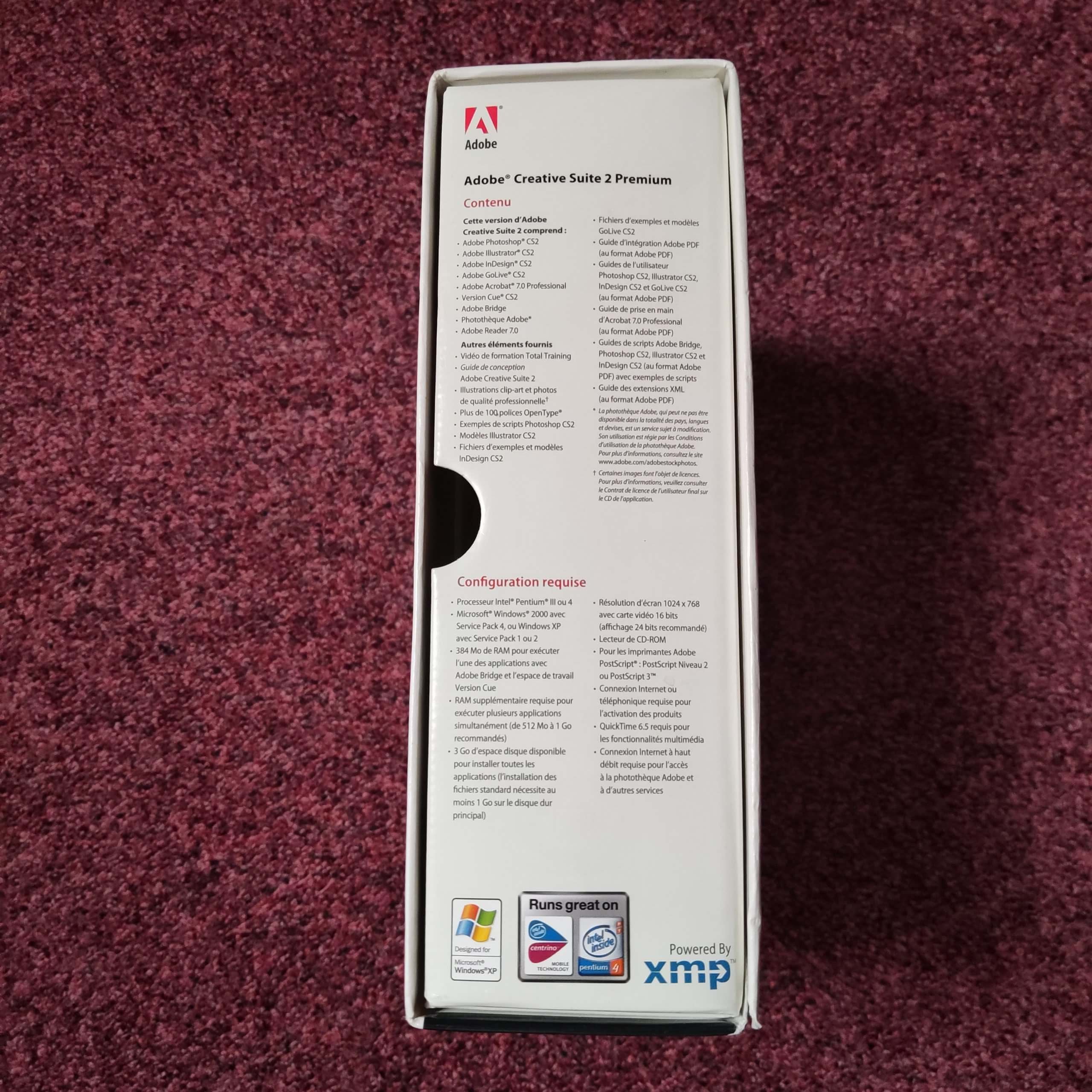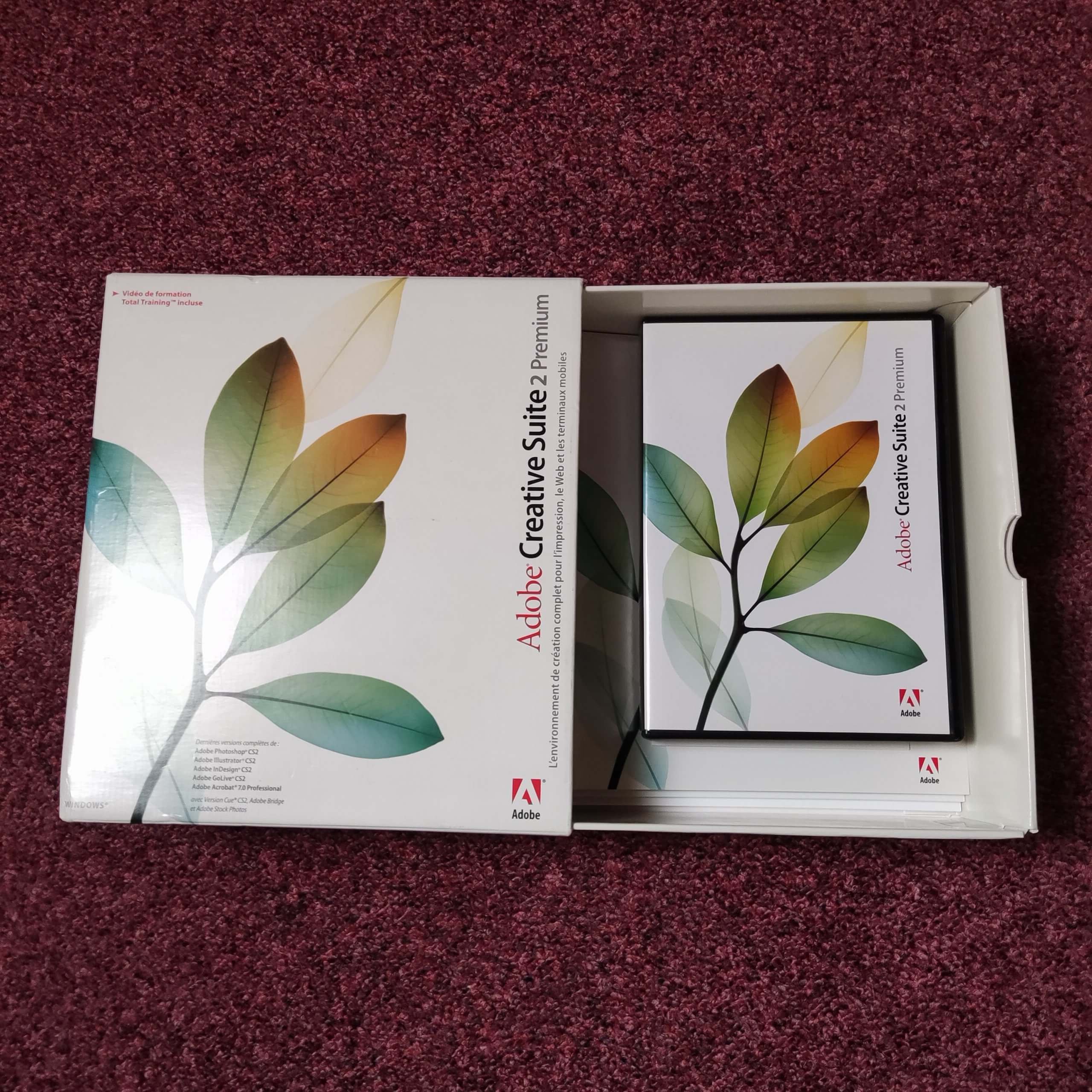 Proposée ici dans sa version française pour Windows, Adobe Creative Suite 2 Premium est présentée dans son coffret d’origine avec l’ensemble de ses éléments physiques.